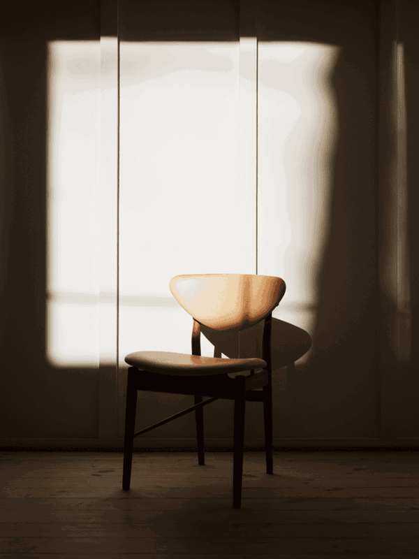 At first glance, Finn Juhl's 108 Chair from 1946 appears deceptively simple. But on closer inspection, subtle details emerge – angled side bars and sliding cross bars introduce unexpected movement and a dynamic structure. Thanks to its durability and refined proportions, the 108 Chair is featured in several exclusive restaurants. Each chair is upholstered by hand in Denmark, in either textile or leather. The frame is available in oak, walnut, or black-painted finishes.