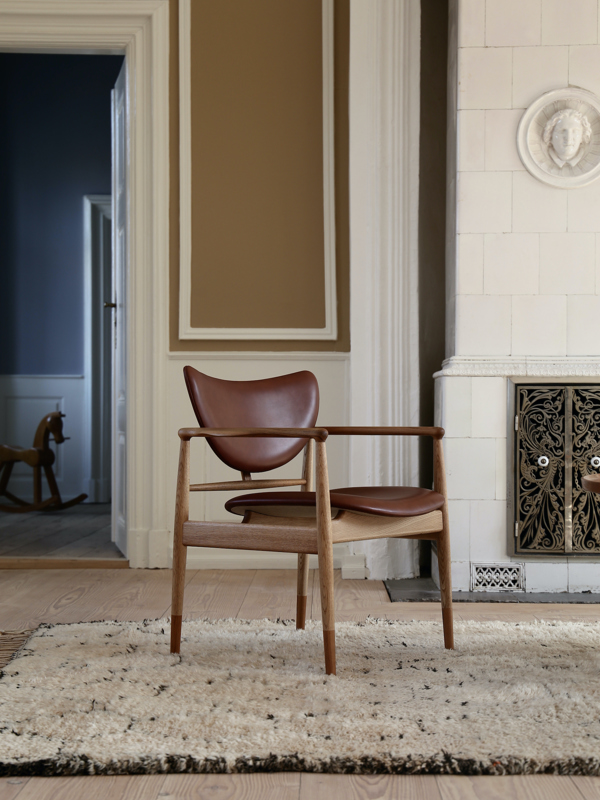 Additionally, the 48 Series is characterized by the use of multiple materials. Today, it is rare to see furniture that employs two different types of wood. This type of contrast has been left almost entirely to Finn Juhl despite the many years that have passed. The 48 Chair is available in oak with armrests and toes in walnut and a version entirely in walnut. The chair is upholstered in either textile or leather.