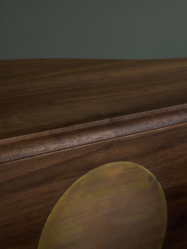 In solid walnut with a circular inlay in brass.