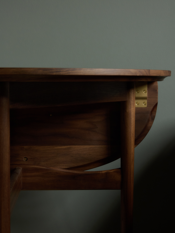 To open the table, the hanging section is lifted and the tabletop slides into a central position, evenly supported by all three legs. Despite its delicate appearance, the Butterfly Table is both functional and refined, crafted in walnut with a circular brass inlay.