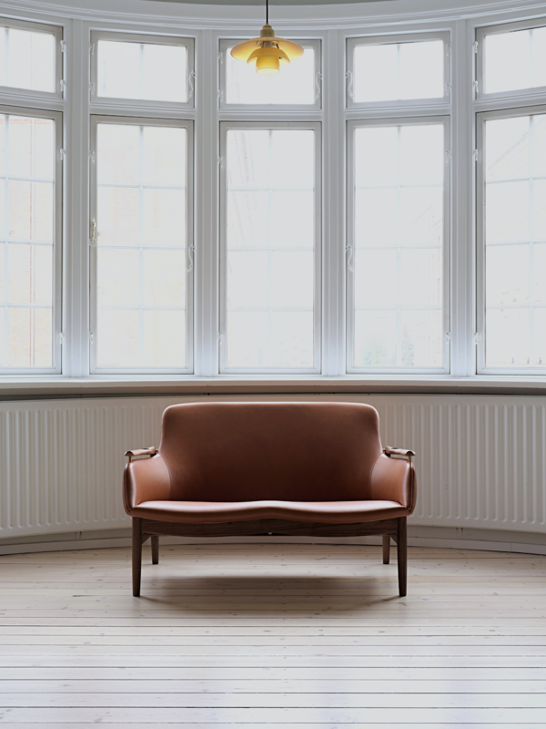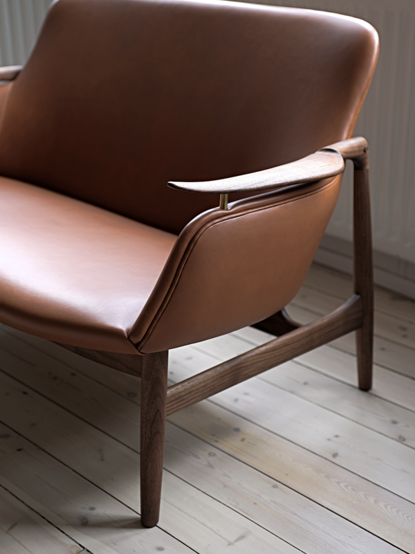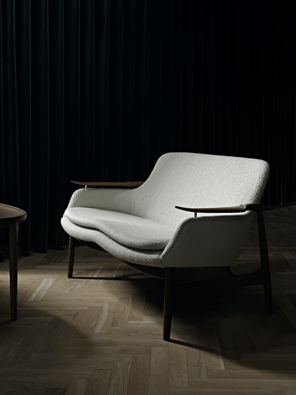 The sofa is masterfully crafted using solid wood, carefully shaped and positioned to create a unique, organic frame wrapping around the upholstery as if it is levitating. The delicate transitions from the rounded to the sharp elements enhance the unique pattern of the wooden grain. Finn Juhl’s artistic approach to design combined with practical and functional needs bring meaning to each shape and element, such that the chair spoils the user with comfort from a lost time. The sofa is spacious and naturally extends an invitation to be seated. At the same time, the sofa keeps the expression light and appears beautiful from every angle. As such, it is extremely well-suited as a free-standing piece for the living room of private residences or lounge areas in hotels and corporate settings.