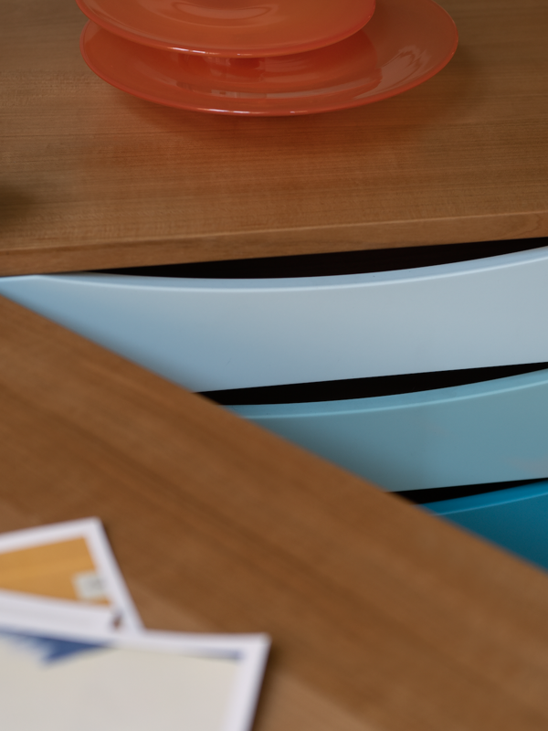 Originally designed to store gloves for Finn Juhl’s wife, Hanne Wilhelm Hansen, the Glove Cabinet was presented at the 1961 Cabinetmakers’ Guild Exhibition as part of an experimental bedroom suite. Crafted from Japanese cherry wood with colorful painted drawers, the cabinet reflects a playful shift from Finn Juhl’s earlier work, featuring burnished steel legs with brass fittings and wheels.