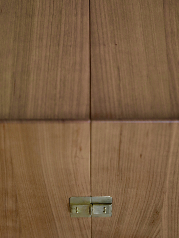 Japanese cherry with drawers in a warm and cold range of colours. Legs in burnished steel and wheels and fittings in brass.