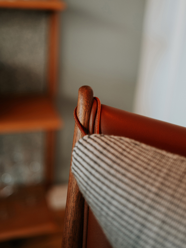 The soft hues on the walls complement Finn Juhl’s Whisky Chair and Egyptian Chair, enhancing the quiet elegance of the space.