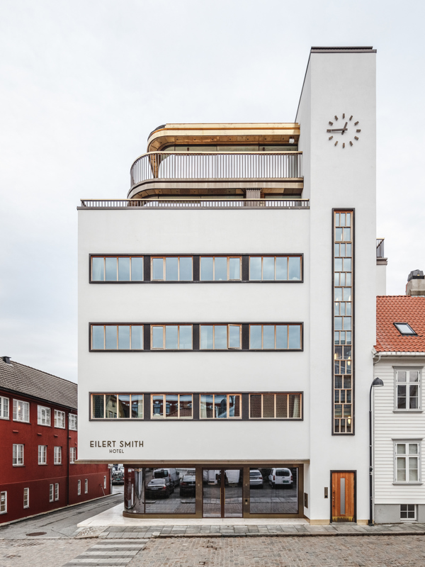 Eilert Smith Hotel is located between Stavanger’s old wooden houses and modern high-rise buildings. The exclusive and boutique hotel with only 12 rooms is named after architect Eilert Smith, who originally designed the building back in 1937. In the 1930’s functionalist architecture was popular in Stavanger. Institutions, businesses, and private houses were built in this new and international style. The building in Nordbogata 8 was not designed as a hotel back then, but as a shop and storehouse for the local farmers’ cooperative.