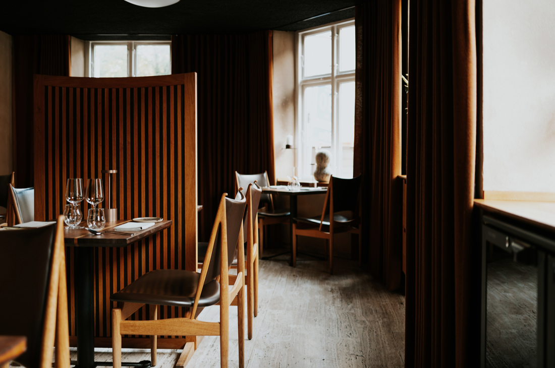 A look through the restaurant with Finn Juhl's Egyptian chairs in oak upholstered with 'Prestige' leather in the color 'Coffee'.