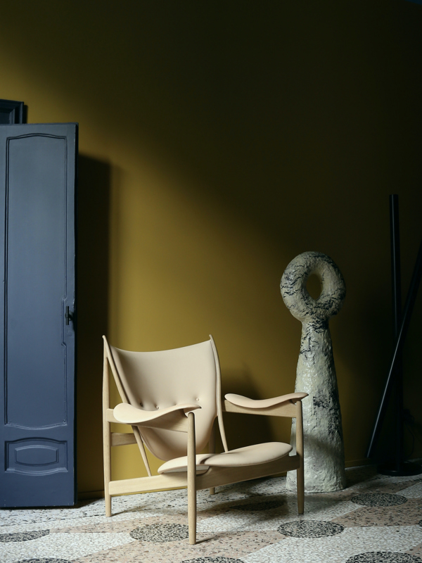 The Chieftain Chair in oak (clear oil) with 'Vegetal' leather upholstery in the colour '90'. Sculpture: Anders Ruhwald / Gallery: Officine Saffi.