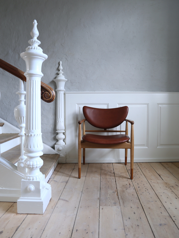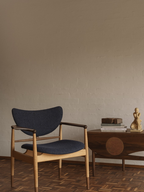 Additionally, the 48 Series is characterized by the use of multiple materials. Today, it is rare to see furniture that employs two different types of wood. This type of contrast has been left almost entirely to Finn Juhl despite the many years that have passed. The 48 Chair is available in oak with armrests and toes in walnut and a version entirely in walnut. The chair is upholstered in either textile or leather.