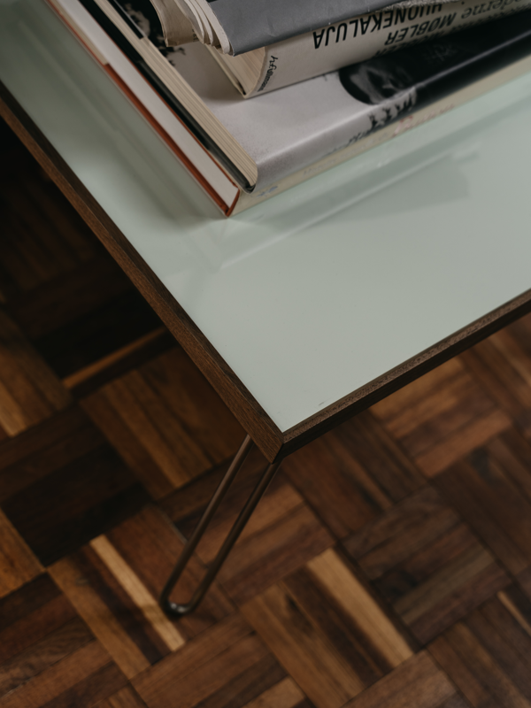 The Tray Table in walnut with light blue high gloss laminate tabletop.