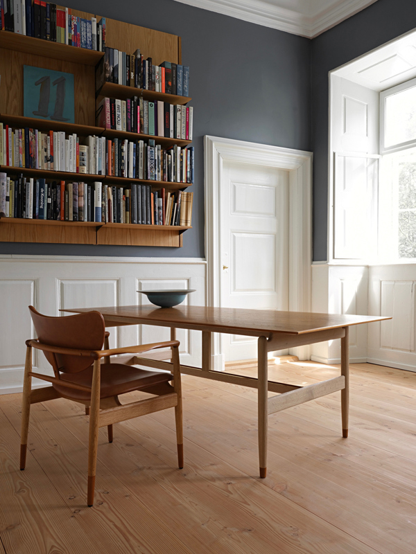 Finn Juhl deliberately worked with a mix of wood types. A dark walnut tabletop contrasts with a lighter oak frame, clearly distinguishing between the carried and the carrying elements. The table's many design details serve both functional and visual purposes.