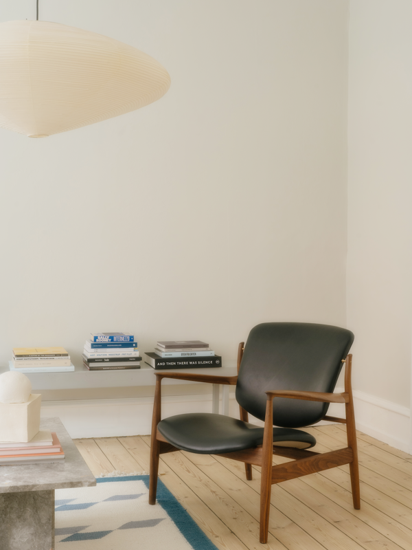 Though one of the few Finn Juhl chairs made for industrial production, it retains fine detailing. The seat and backrest are lifted from the frame, and the armrests feature the iconic paper knife detail found on the 45 Chair.