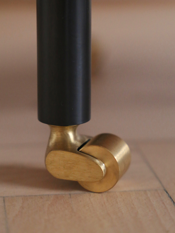 Japanese cherry with drawers in a warm and cold range of colours. Legs in burnished steel and wheels and fittings in brass.
