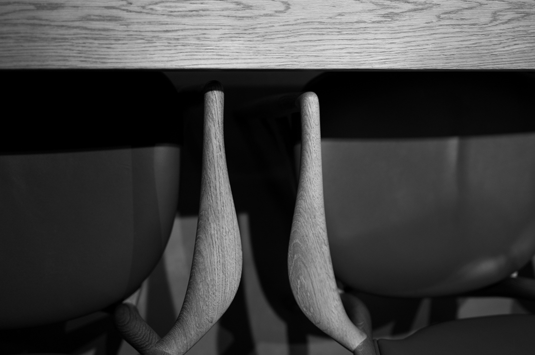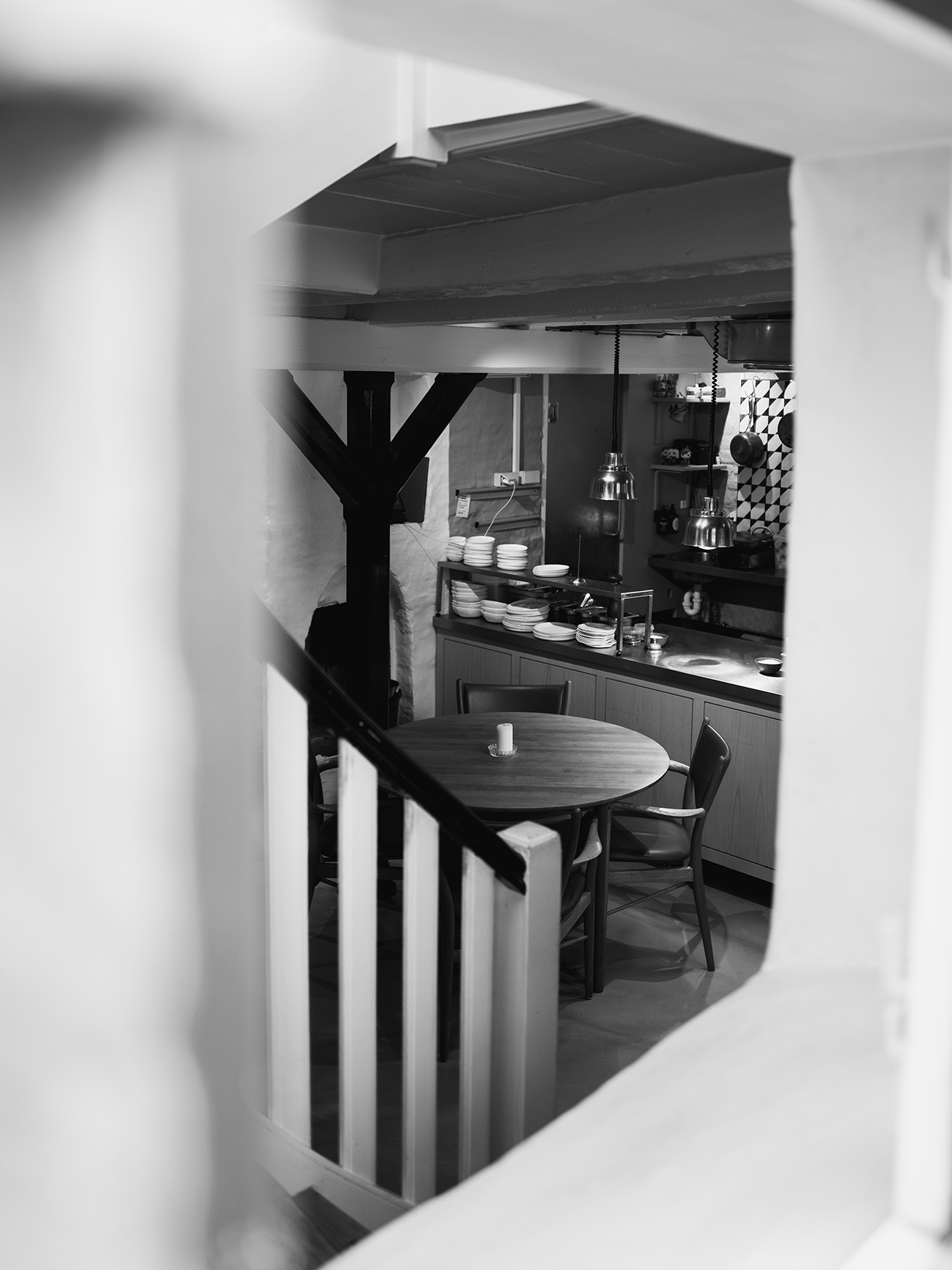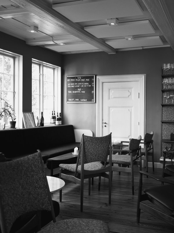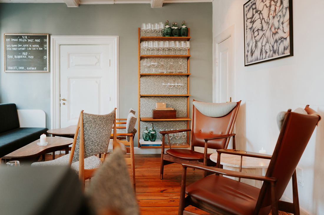 A glimpse through the bar on Gammel Mønt, tastefully furnished with pieces like the Egyptian Chair and the 48 Chair by Finn Juhl.