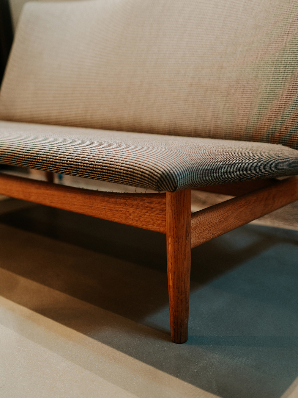 Along the wall in the bar’s lower level stands Finn Juhl’s simple and elegant Japan Sofa.