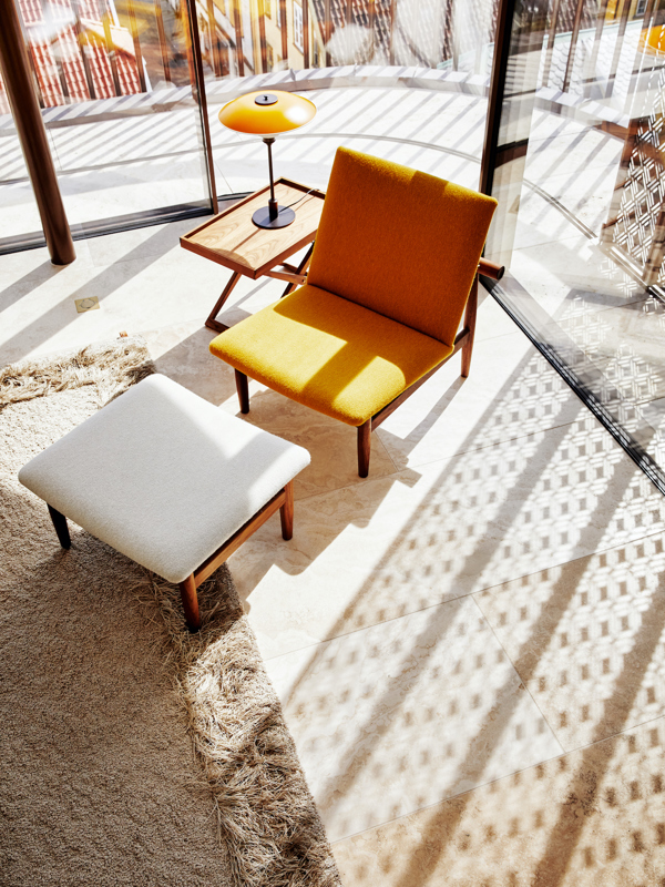 Discover the Finn Juhl pieces that are featured at the boutique Eilert Smith Hotel. Click through the furniture below to dive into the history behind the creation of the individual pieces and find inspiring, captivating images along with information about different material options and the sizes available.