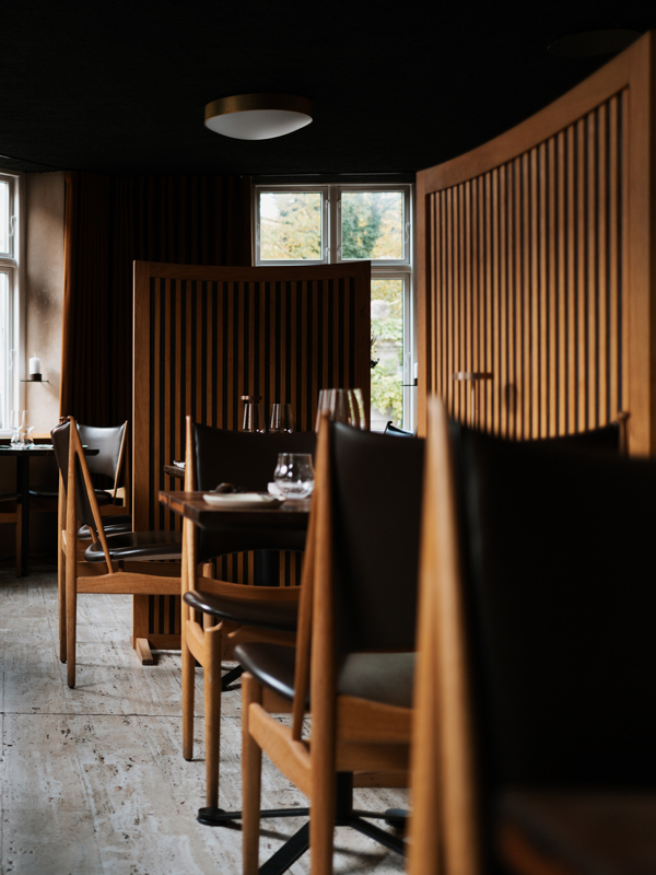 A look through the restaurant with Finn Juhl's Egyptian chairs in oak upholstered with 'Prestige' leather in the color 'Coffee'.