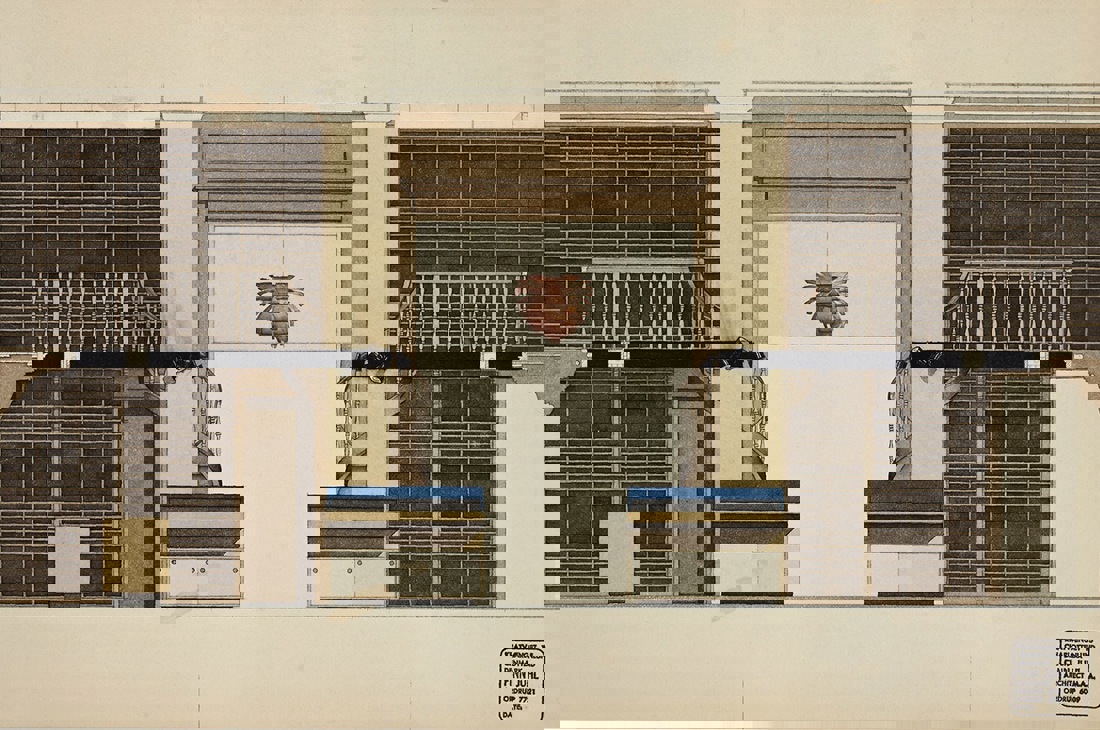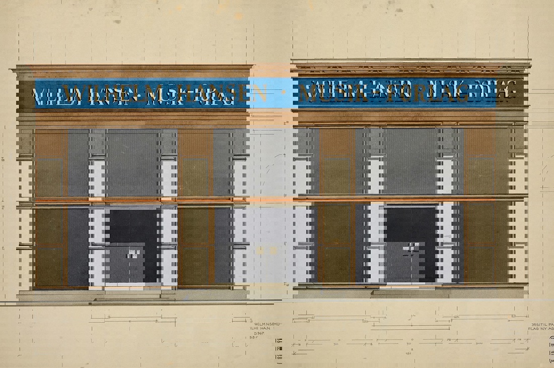 Watercolor drawing of Wilhelm Hansen’s music publishing store, which Finn Juhl redesigned in the 1960s.