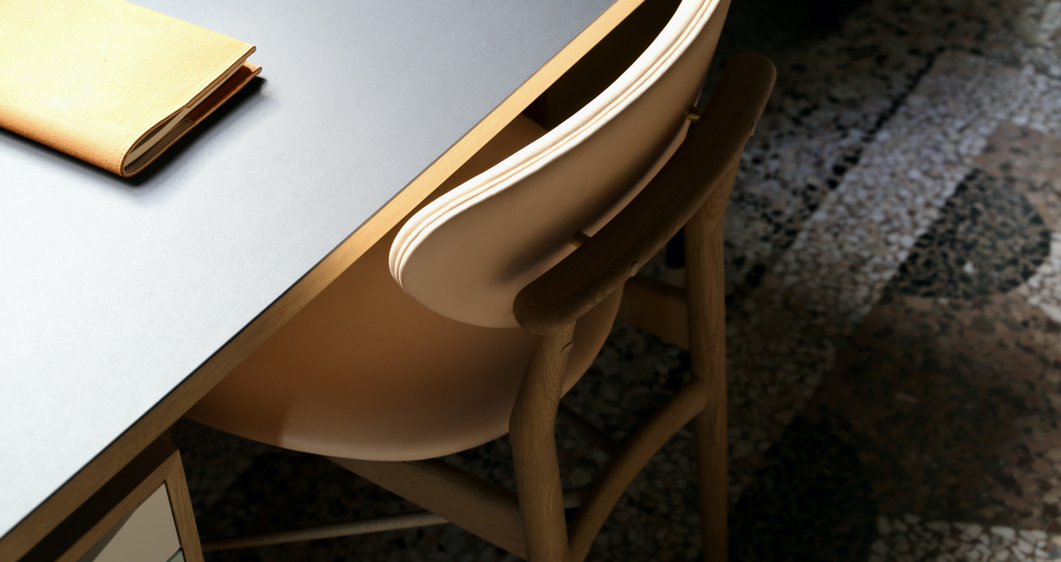 The Nyhavn Desk (136 cm) in oak (clear oil) with the 'Cold' colour tray unit and linoleum tabletop in the colour 'Black' paired with the 108 Chair in oak (clear oil) with 'Vegetal' leather upholstery in the colour '90'.